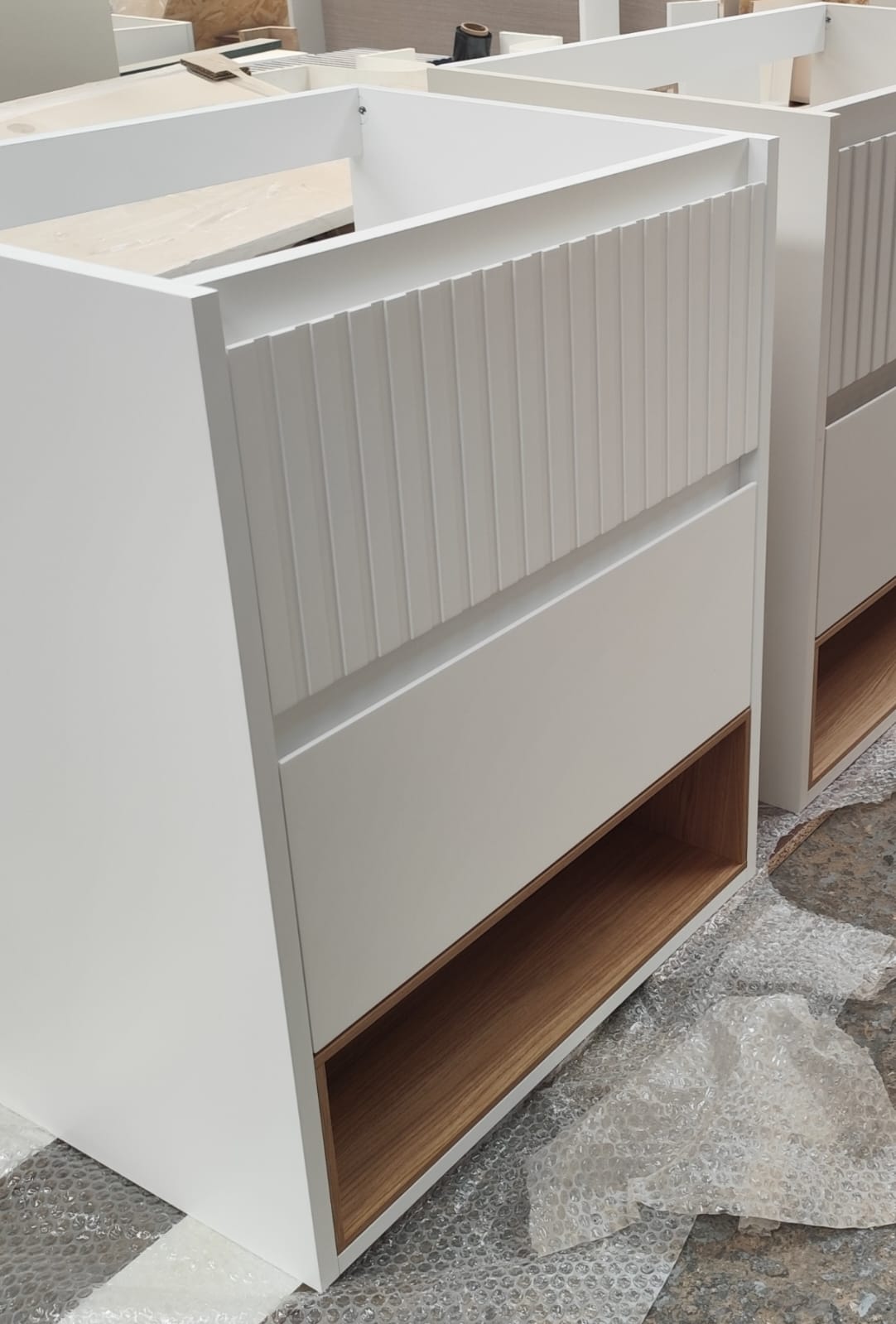 Mueble de baño con 2 cajones y espacio para guardar toallas, fabricado en mdf pintado y elementos estructurales de paja.